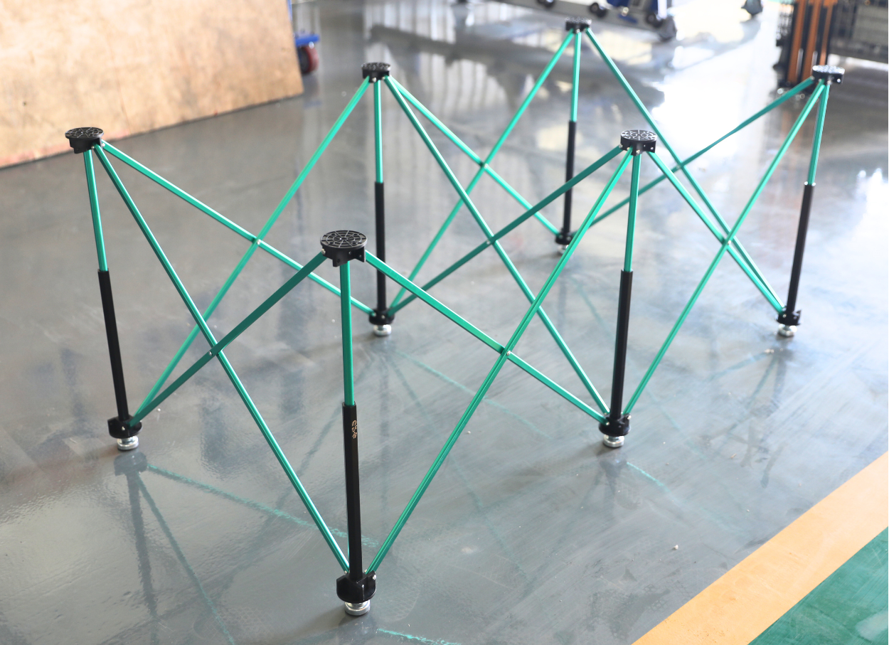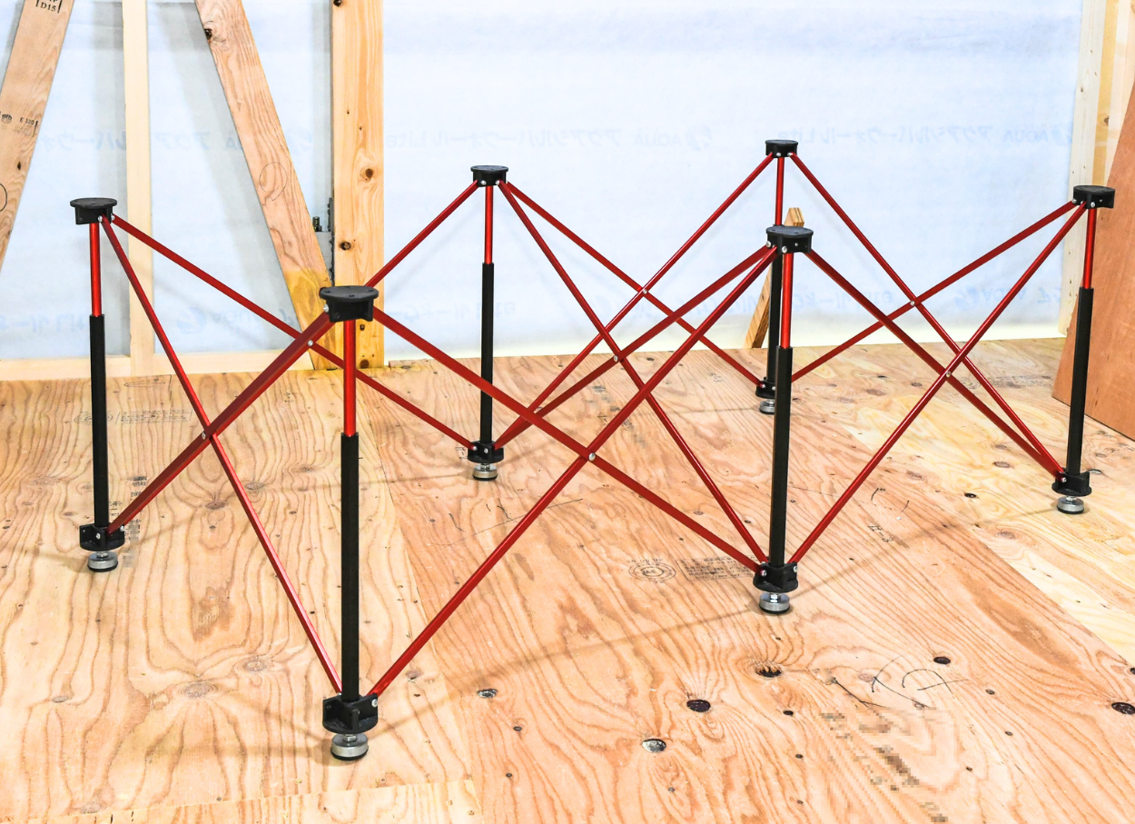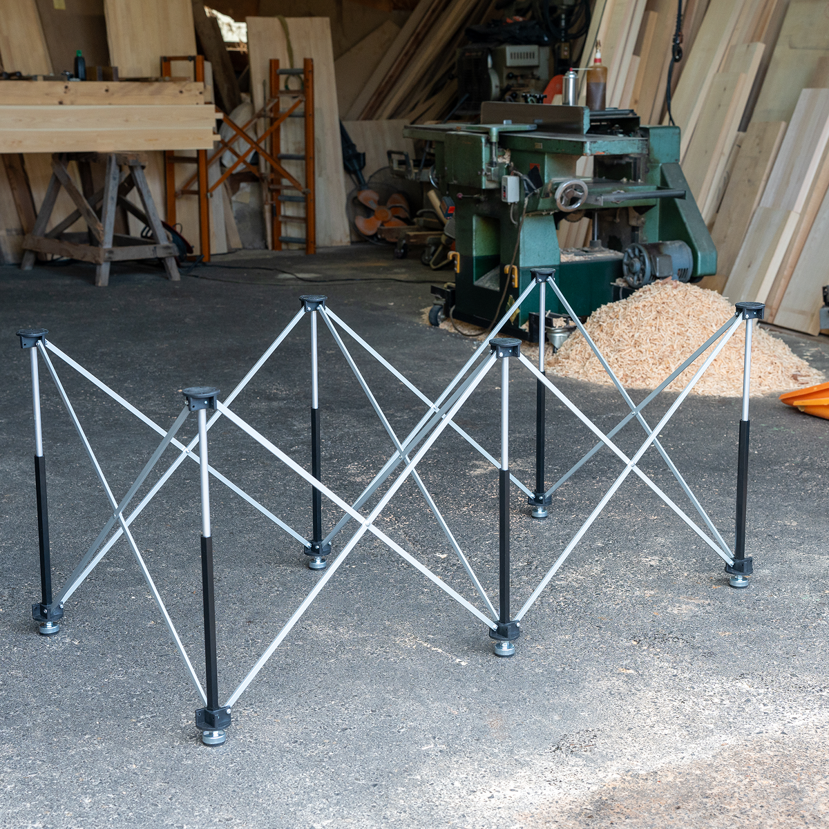 構造がシンプルで自由度がある反面、組み立てや持ち運びに手間がかかったり、使用中のガタつきや耐久性に難があるという課題もありました。